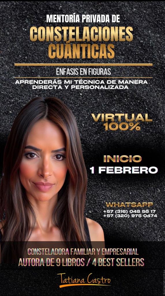 Tatiana Castro Abuchaibe es autora de 9 libros, 4 de ellos Best Seller, creadora de las Constelaciones Cuánticas, conferencista internacional, coach gerencial y de vida, y una figura pública reconocida en Latinoamérica. Es una de las voces más influyentes en transformación personal, liderazgo, abundancia y espiritualidad práctica.